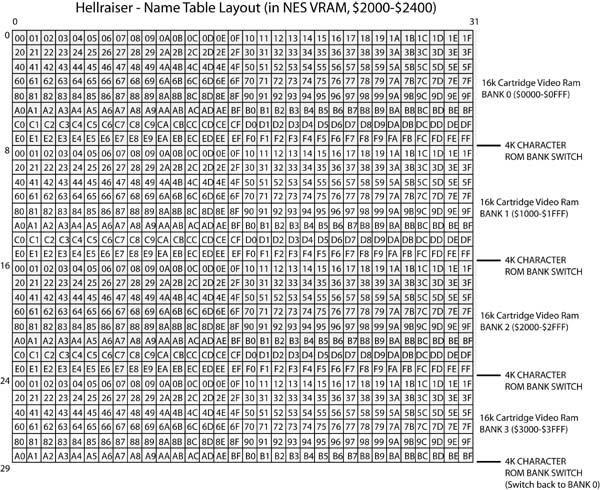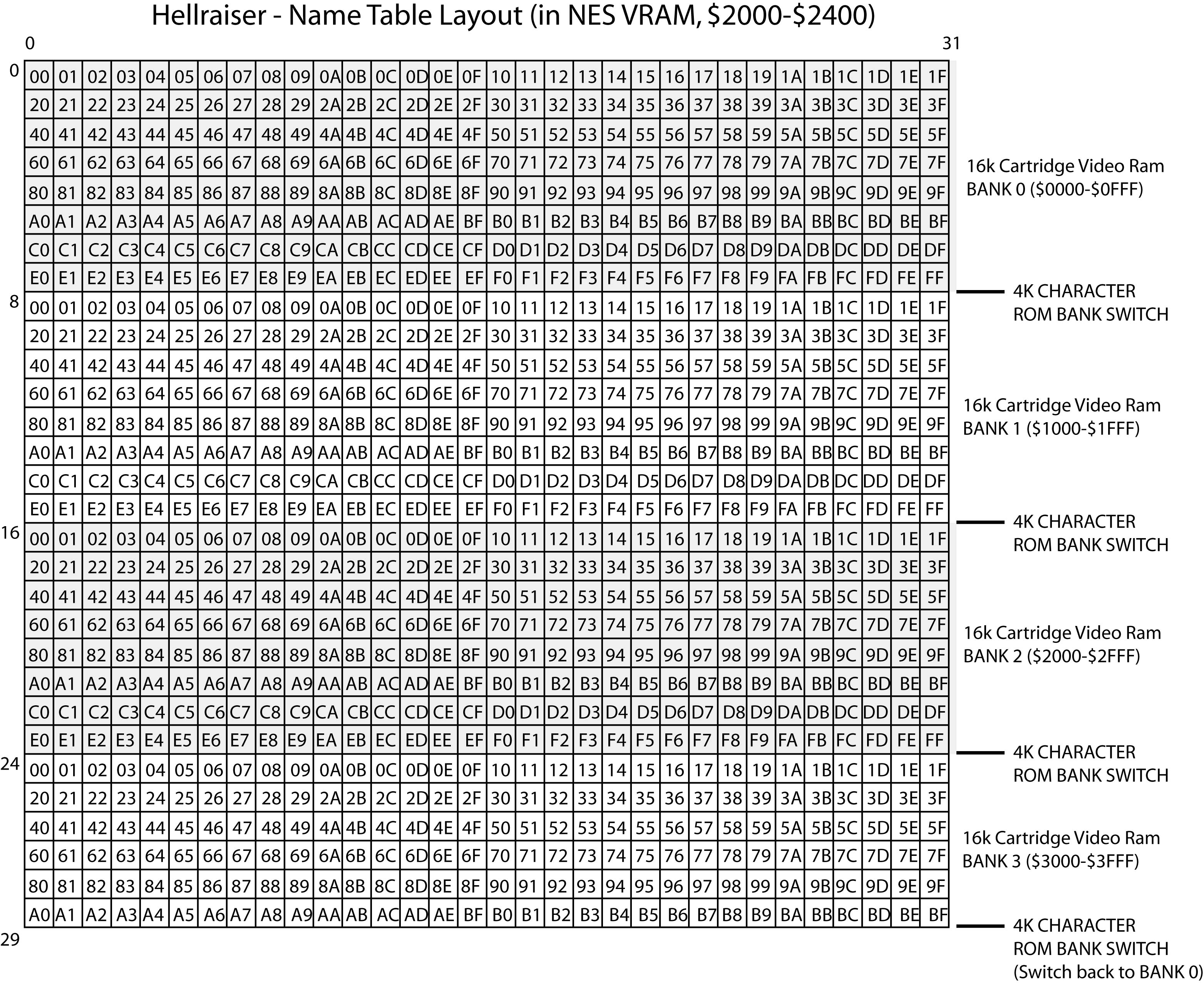 provides 256 different characters titles, $00-$FF. 3) Note in the above Figure 1, how characters 0-255 are mapped going left to right to fill up the screen. Every 8 "tile lines" (64 scanlines) the characters repeat. 4) The PPU begins to draw the screen at 0x0. Since the characters are laid out in the name tables as they are in memory, it should reproduce the top 64 scanlines (top 4k) of the video RAM as drawn by the cartridge, much like a regular raster display in screen memory. 5) The scanline counter on the cartridge will detect every 64th scanline. This is when the PPU reaches the end of the 256 characters and the characters will start repeating themselves on the next line. (the "4k Character ROM bank switch" in Figure 1) 6) During the horizontal blank after scanline 64, the cartridge switches to the NEXT bank of 4k in the 16k video RAM. Thus, as the PPU draws the next 256 characters/8 lines/64 scanlines, it's an all new set of "characters" There are 4 "banks" of characters per screen, though we don't see the last 2 lines of the last bank, since the display is 32x30 tiles, not 32x32. 7) The RAM bankswitching could be performed by the Z80 or a 8 bit counter. (bits being 0-7) Basically... a) Bits 0-5 would count every 64 scanlines, based off the rising edge of CHR A12 which would be tied to the CLK of the counter. This would then cause Bits 6 & 7 to act like a 2 bit counter triggered every 64 cycles. b) Bits 6 & 7 would be tied to the A12 and A13 lines of the 16k video RAM, to select which 4k bank to bring up. 00=Bank 0 01=Bank 1 10=Bank 2 11=Bank 3 c) During the vertical blank the counter would be reset to 0, so it can start over when the screen is redrawn. This would also put the video RAM back to Bank 0, as bits 6 & 7 would be 00 Potential Problems: 1) Would there be a "clean" transition at the bank/scanline changes? Ever notice most MMC3 games that have a "split screen" effect, there's a bit of flutter just above the line and about 2/3 across the screen? (Real NES's, not emulated) See Mega Man 3, Super C, Mario 3 2) When would the Z80 draw the 16k video RAM screen? Wouldn't that interfere with it as the NES addressed it? 3) On that note, would a second 16k RAM be required as a draw-screen frame buffer? Could this be swapped into the NES addressed 16k video RAM quickly enough, say during the vertical blank? Maybe this is why Hellraiser had 64k of RAM 4) What could be done about the 4 color limitation? That's about all the thinking I can for now on this, but I'd encourage people to give it some thought themselves. A homebrew of the "Lost Hellraiser" cartridge might be cool! Email me to discuss! If I'm WAY off on something let me know, but I think the principal is sound. Maybe an even BETTER CPU could be used, like a 68000! Or perhaps this "super cartridge" could use a memory card, like the Cuttle Cart 2. Therefore, you get the super cartridge and play the games off the memory card. It could be a new classic gaming platform! I'll probably update this page with some ideas on sound and color improvement... If you have any ideas, let me know and I'll add them. Let's raise some hell!