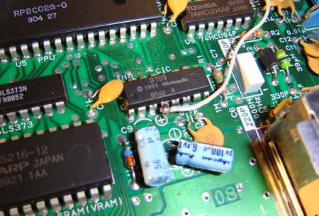 Lockout Chip and Make Tengen Smile! Apparently one of the big reasons a NES cartridge doesn't always load is because the lockout chip inside the NES and the one in the cartridge must "talk" to each other before the system is allowed to boot. Corroded (that is, not blown on) cartridge connectors can prohibit this data transmission from taking place. If the screen flashes on boot that's the problem. The solution? Kill the lockout chip! Now you can't outright remove it (I tried - the NES won't do squat if it's gone) but if you pull up Pin 4 (as shown below) and connect it to Ground (instead of +5 volts as it is normally) the lockout chip will be kicked in the junk and fail to stop any Color Dreams or pirate cartridge you stick in it. Though considering the quality of most Color Dreams games you may actually thank the chip for existing in the first place.