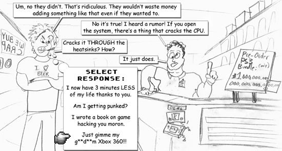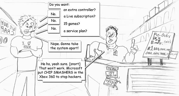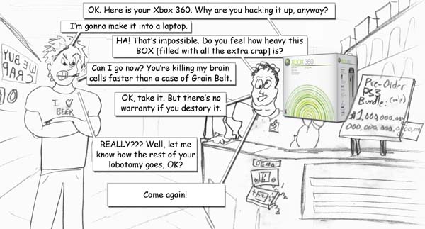 A friend of mine asked back in May "Can you build an Xbox 360 laptop?" And I responded "Sure, can you pay for it?" He agreed, and thus I set forth on what was surely to be my most complex and insanely ridiculous videogame project yet. (I say videogame project as I highly doubt I'll ever manage anything as complex as Port Washington again, though at times this project sucked my will to live about as much) With my first batch of "venture capital" in hand I ran off to the nearby store to get myself an Xbox 360 Super Package, or whatever the $400 version is called. While I won't mention the game store I stopped at by name, I will recreate the amazing conversation I had with one of their employees...