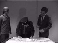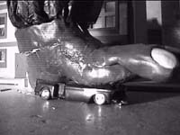 a copy of the film on DVD! The Story Like a lot of our movies, the idea for Lizard of Death started at a bar. Back in March of 2000, two friends and I were drinking, and we met the uncle of one of the friends. The uncle was somewhat infamous for driving a tank (on loan from the armory) through the downtown during a parade in the late 70's. After the uncle had left, we started joking about him driving his tank over all sorts of things, like walls of fine China and a bear, smashing it into a convenient bear-skin rug (keep in mind we were drinking:) Someone then suggested he would fight a giant lizard with his tank. We joked about that for a bit, and then I said the inevitable words "Hey, that would be a good idea for a movie!" We first discussed making a movie that takes place in modern day, with a giant lizard attacking a town. It would be done cheesily of course. We then thought, why not make it in black & white, to give it the old movie feel? I then decided, why not make it a 1959 period piece, with costumes & everything, so it would be an emulation of a bad 1950's horror movie? This thought process took about 4 days. Within a week we said "LET'S DO IT!" "Lizard of Death" (LOD) was a low-budget "go" (meaning: enough of your friends agree to help :) The basic idea was, a bankrupt movie studio made LOD in 1959, but wasn't able to complete it due to lack of funds, therefore making the film very short (and bad). We would "ghost make" this film, putting fictional actors & directors names in the credits. In theory, if someone didn't know anyone or any of the places in the film, it would look like it came from the 50's. As mentioned above, LOD is an emulation, not a parody, of a bad 50's horror movie. For everything "bad" in the movie we had to decide why it was bad. Did the producers not have enough money? Time? A clock on the wall is more likely to just not run/change at all, rather than change with every shot (see "Destination Mars") The most important source of badness, however, was the writing. I was a huge Mystery Science Theatre 3000 fan back in the day, and I drew upon that as a source. Whenever I put something *questionable* in LOD, I thought "what would the robots say about this?" Often I would put sub-notes in the script to give the actors clues as to what was specifically supposed to be bad about the shot, mostly to make them laugh and help them 'pre-visualize' what we were shooting for. A few bad things snuck through on accident, naturally, such as Mayor Stone holding a bundle of dynamite while smoking a pipe. The 2 main movies I drew badness "tone" from were "Attack of the 50 Foot Woman" (mostly FX-wise) and the supreme film of crappiness, "Robot Monster". If you haven't seen "Robot Monster", and you're a lover of bad film, SEE IT. If you don't laugh as a "robot" made of a gorilla suit with a diving helmet ambles like a drunken bear across someone's backyard in California towards his bubble-spewing "calcinator ray machine" that destroyed Mankind (yet sits on a card table), then something is wrong with you. (Astoundingly enough, Elmer Bernstein did the music for "Robot Monster"! Granted, it was one of his first gigs back in 1953, but man, this is the guy who only a few years later scored "The Ten Commandments" and later on movies like "Ghostbusters". However, he came full-circle and did the music for "Wild Wild West" in 1999) Excited about making a crappy 50's movie, I paused my other current at-that-time project for a month so I could write LOD. You may have heard of the 'other project', it was my first portable Atari 2600. Once LOD was written, I finished the Atari, but didn't make a website [for the Atari] until that fall, after I had filmed all of LOD.