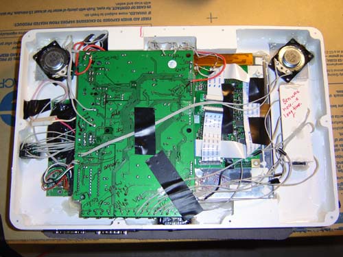 First we shove in the screen. It’s an 8″ TFT active matrix one that originally had a TV tuner, CompactFlash picture viewer (how useful) and some other crap. I compacted it down to just a PCB and the glass for use in this project. There’s a lot of ribbon cable between the main board and the glass so I could position things with relative ease.
