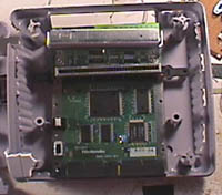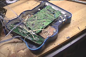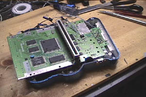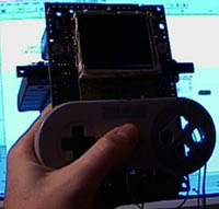 One thing I had to work around was the controller. The above photo shows the circuit board of a SNES controller. It’s been hacked down a bit, however. Anyway, the SNES has a latched input controller. (Most/all systems after the Sega Genesis do, actually). Instead of having a wire and circuit for every button (as with the Atari 2600) the latched input controller combines all the button data into a couple address lines. That’s how a system like the N64 can have all those buttons on the controller but with only 3 wires on the plug. So, instead of re-working the system, I decided to just put the original SNES controller circuit board inside the unit. (hey, there was enough room). This is also how I did the PSp’s controller. I then wired my new control switches directly to the appropriate spots on the SNES controller.