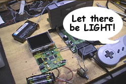 When building a portable unit, a large problem is always power consumption. Your average pocket TV uses 500ma of power. Add that to the SNES’s power intake (around 250ma) and you’ve got 750ma. Also, just adding wires between things increases the power drain. SO! As with the VCSp Gold and the PSp, I replaced the cold-cathode light tube on the TV with 2 white LED’s, again from Radio Shack online. (here is a link to that item). Basically what I do is remove the tube, and stick an LED on each end, thus ‘simulating’ a tube. I also have to remove the power supply for the tube. Typically, there’s a spot on the TV’s board which sends +5 volts into the cold cathode tube power supply. This power supply then steps up the voltage to something like 800-1000 volts to power the tube. After I remove the power supply, I power the white LED’s off that 5 volt pin (it’s convenient). I typically put about 20 ohms resistance in front of the LED’s and then wire them in parallel. This drops the TV’s power consumption from 500ma to around 250ma.