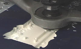 Here is a close-up of the router routing the front half of the SNESp case. The bit (in that circular metal vacuum thing) goes back and forth, cleaning out sections at a time. Typically, I use a 1/4″ and 1/8″ bit to cut out the case. The 1/4″ bit does the main clean out work (as shown above), then, to drill the screw-holes and button openings, I use the 1/8″ bit. I also sometimes use a V-shaped bit to chamfer the edges of items. With the SNESp, I chamfered (or beveled if you will) the edges of all the brushed aluminum plates.