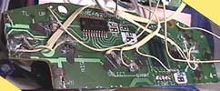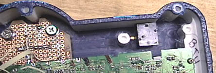 Here is part of the SNESp’s interior. You can see a screw post (the white thing near the middle), the TV’s circuit board, and the trigger controls. For the buttons & controls I use tactile pushbutton switches. These switches are cheap (around 20-30 cents each) and mount easily to standard PCB’s. I highly recommend them to anyone building a portable unit. As for the controls themselves, I switched gears and used the original SNES control pad & buttons. I just liked them, I guess. They went well with my color scheme! The Select/Start button was custom, however.