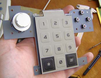 So here’s my big chance to change the world, one thumbstick at a time. I simply made my unit have a miniature version of the Coleco stick (brushed aluminum and all) that worked with a human’s thumb! Astounding! In the photo you can also see the number pad (note – the final product used a different numberpad) and the 4 triggers.