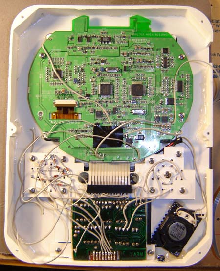 With the controls all wired up I moved onto the screen and stuffing all these parts into the front half of the case. The insides look like this: