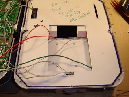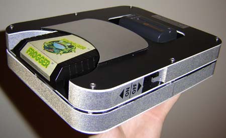 Here’s the rear half of the unit. Yes I know it doesn’t look like much. Under that plate are the power switches, A/V jacks, power ports as well as the +12 volt step-up regulator (it didn’t fit in the front of the unit) The gap in the middle is where the cartridge slot will connect.
