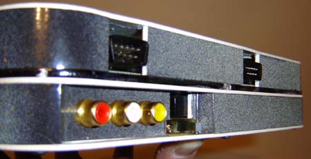 Left side of unit, with A/V output jacks, PS1 screen on/off switch and controller ports. The ports are in their original positions on the motherboard. Why re-invent the wheel if it already rolls?