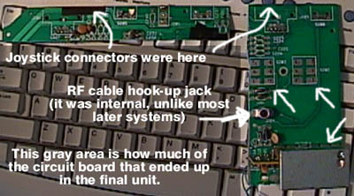 Here are the portions that were sawed off the original board. The silver square things on the right hand side were where the RESET and SELECT switches were. The silver thing in the lower-right hand corner is the RF modulator.