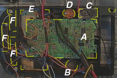 A): The circuit board of the portable television. The portion near the ‘A’ has the screen, so it’s the thickest. To the left is just circuit board, since that’s where the batteries were on the original pocket TV. This space allowed me to place the Control Pad Circuit Board (E) right on top on it. (well, it appears BELOW it here). In the lower left corner of the TV circuit board you can just make out a screw that attaches to control circuit board, holding the TV circuit in place.