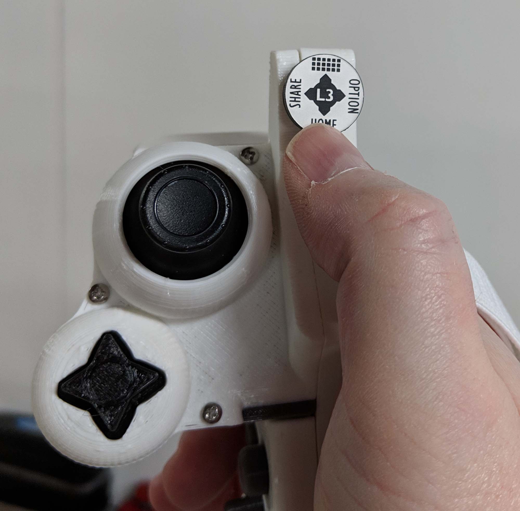 Someone on YouTube suggested a 5 way switch for the various PS4 controller buttons to save space and I took their advice! I call it the “Multi-Hat” switch. Press up for the touch pad, left for Share, right for Option, down for the PS Home/On button, and press the hat in for the L3 button.