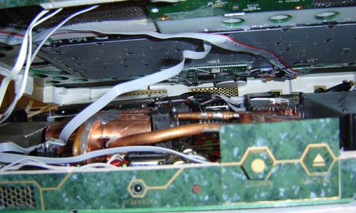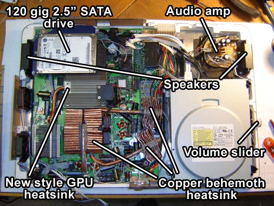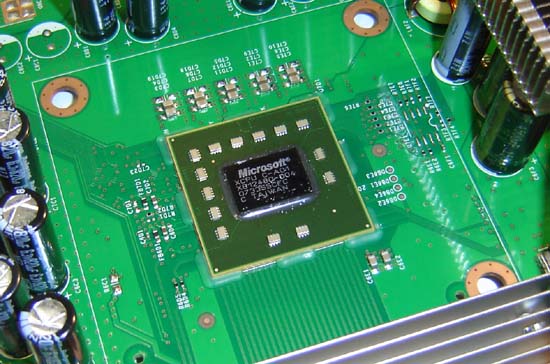 Shown above is the new 65nm CPU in the Falcon unit. The main IC itself is smaller than it used to be and thus smaller than the unchanged GPU die. The heat spreader area (heat spreader being about the lamest-sounding term on Earth) is also smaller and now rectangle shaped instead of square. As mentioned in my earlier post this CPU runs a lot cooler than the old one and even within this unit about 20 degrees cooler, on average, than the GPU.