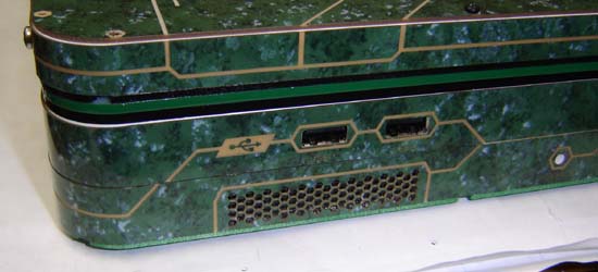 Close-up of the USB ports. I didn’t want to specifically “rip off” Halo 3 graphics for obvious reasons but I used a lot of the same concepts. Specifically there’s lots of lines connecting things, the colors orange and green (like the interception-mad Packers) 45/90 degree angles and the ever-present hexagon. Every vent hole on this unit is a small hexagon, which took longer to draw up than I care to admit.