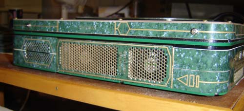 Above is a photo showing everything in the base of the unit. This was just before I swapped out the Xbox motherboard for a new “Falcon” 65nm model, but it basically looked the same. For the audio amp I bought a cheap pair of computer speakers from Tiger Direct (originally to be used on the PS3 laptop but this unit came together first) and modded its circuitry to fit in the case. The speaker amp pulls power from the main 12 volt line so they turn on with the Xbox.