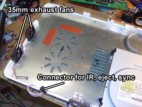 When you’re making a slim case fans are a big issue (and they smaller they are the more expensive they become). On the left side of the unit there is no motherboard, so I could use larger, better, cheaper 35mm fans. These are 12 volt units that I tied directly to the Xbox’s original fan connection, thus allowing the system to control them. (Something that apparently happens but I’ve never really witnesses) The rest of the fans are 5 volt, we’ll get to those in a moment.